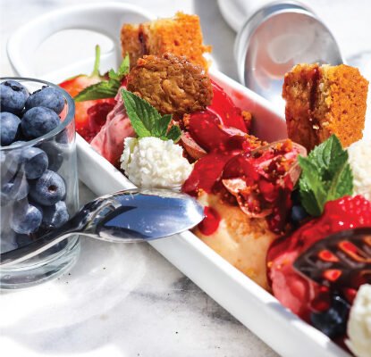 Anschliessend beliebig portionieren und garnieren. Dazu passt hervorragend ein Erdbeertopping, Erdbeerpapier oder Erdbeer-Crumble und frische Minze oder Melisse aus dem Garten.