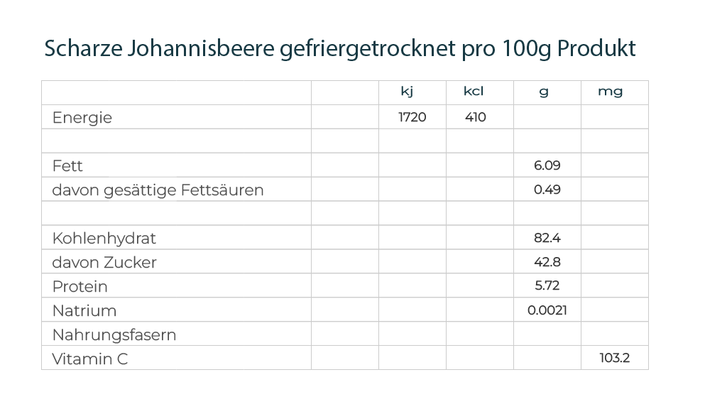 Bei gefriergetrockneten schwarzen Johannisbeeren, dies gilt grundsätzlich für alle gefriergetrockneten Früchte, verlieren einen grossen Teil ihres Gewichtes. Als Faustregel gilt bei allen gefriergetrockneten Beeren, bzw. gefriergetrockneten Früchten, dass diese rund 90% ihres ursprünglichen Gewichts verlieren. Dieser Wert ist auch etwas davon abhängig, mit welchem Verfahren innerhalb der Gefriertrocknung die Früchte, bzw. Beeren gefriergetrocknet werden. Die gefriergetrockneten Früchte Produkte von Fruit-comestible weisen einen tiefst möglichen Anteil an Restfeuchtigkeit auf, dies ist nebst dem Reifegrad ein absolutes Qualitätsmerkmal. Dadurch erhalten Sie den charakteristischen, typischen Knusper-Effekt beim Geniessen der gefriergetrockneten Früchte. Die gefriergetrockneten Früchte von Fruit-comestible sind so ernährungsphysiologisch hochwertig, dass die in der Frucht enthaltenen Enzyme wieder aktiv werden, sobald sie verarbeitet werden. Es empfiehlt sich grundsätzlich, wenn die gefriergetrockneten Früchte in Torten oder Crèmen verarbeitet werden, die Fruchtmischung einmal zu erhitzen um die Enzyme zu deaktivieren. Aufgrund der hohen Dichte an Nährstoffen sind gefriergetrocknete Beeren besonders auch für Smoothies sowie für besondere Ernährungsformen geeignet. Da schwarze Johannisbeeren von Natur aus eine Vitamin C Bombe sind, sollte man gefriergetrocknete schwarze Johannisbeeren nicht in übermässigen Mengen auf einmal verzehren, sondern besser kleinere Mengen dafür öfter. Der ideale Begleiter in der kalten Jahreszeit, wenn Erkältungsgefahren hinter jeder Ecke lauern.